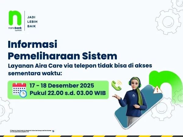 Selama periode pemeliharaan berlangsung, Nasabah tetap dapat menghubungi Aira Care melalui email airacare@nanobanksyariah.id untuk kebutuhan informasi maupun bantuan layanan.